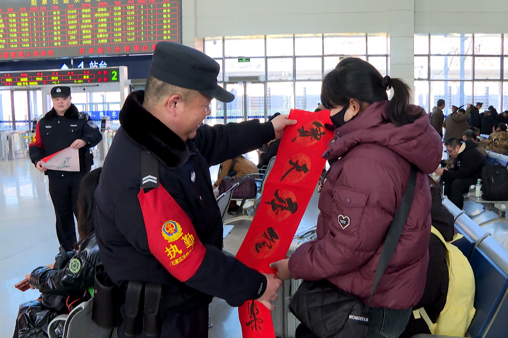 春运首日,阳泉北站还邀请众多书法爱好者现场挥毫泼墨,为旅客们送出一副副春联和福字,让大家感受到了浓厚的节日氛围。
